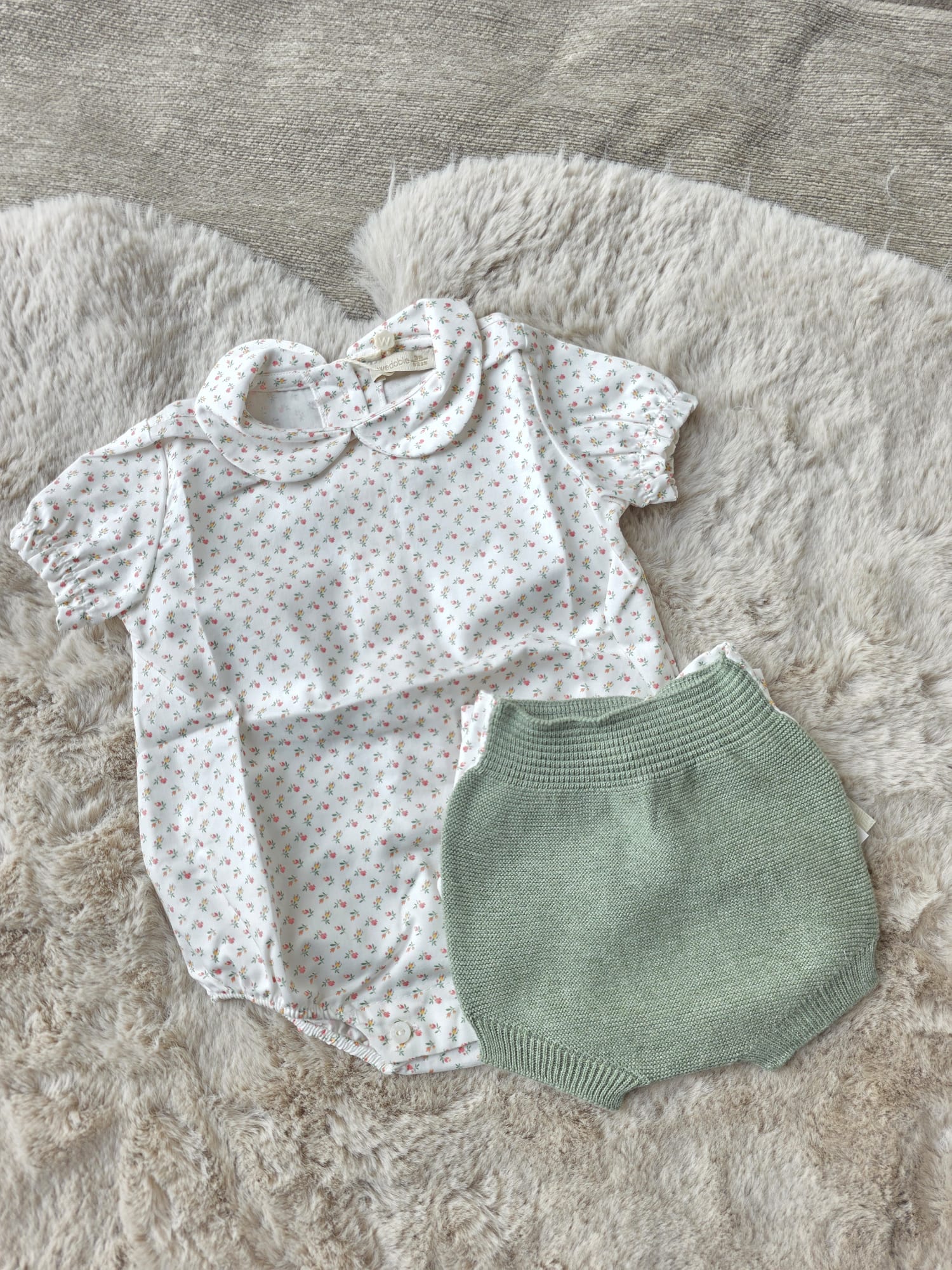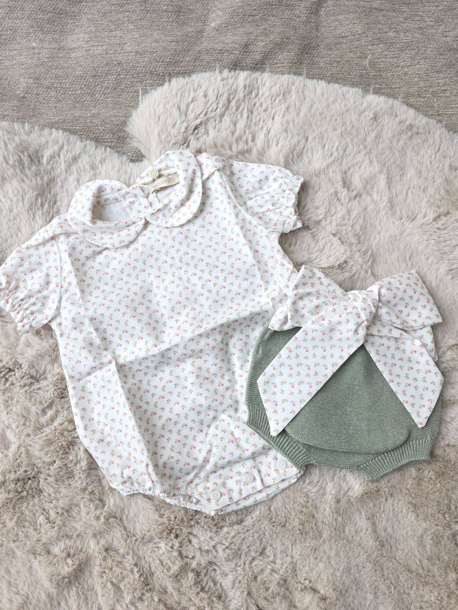 - Body a maniche corte con colletto a volant: Realizzato in un tessuto leggero e delicato, presenta una graziosa stampa floreale con piccoli tocchi di rosa e verde su sfondo bianco. Il colletto a volant aggiunge un dettaglio romantico e senza tempo, mentre le maniche corte lo rendono perfetto per la primavera e l’estate. La pratica chiusura con bottoncini (verifica la posizione esatta) assicura cambi facili e veloci.