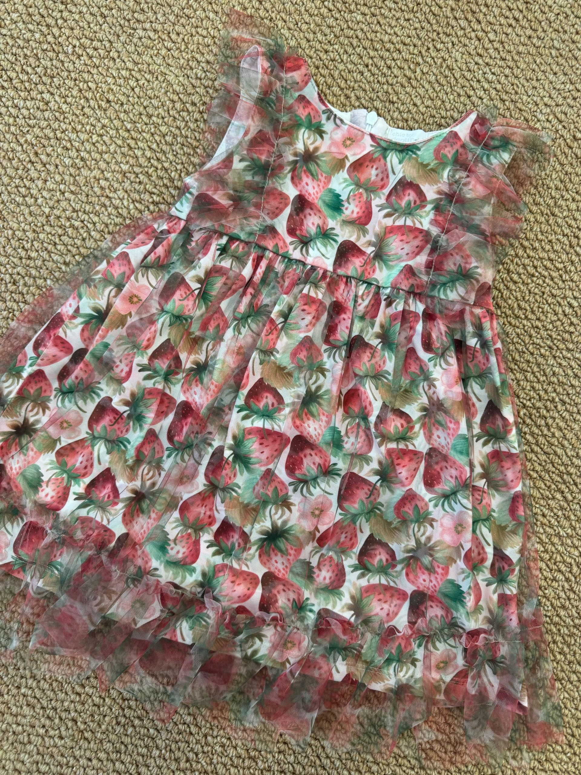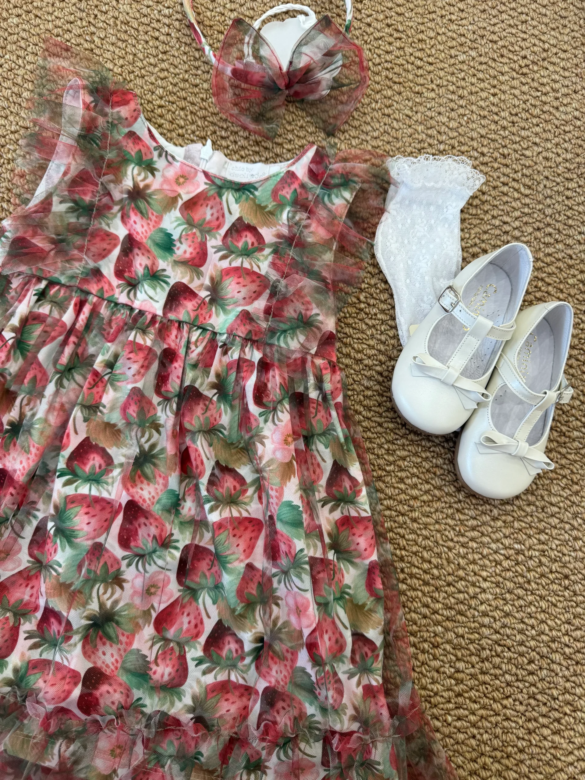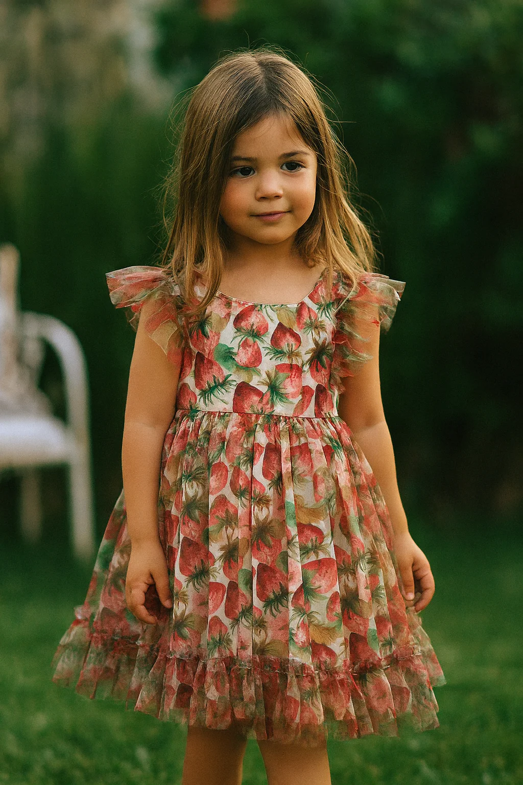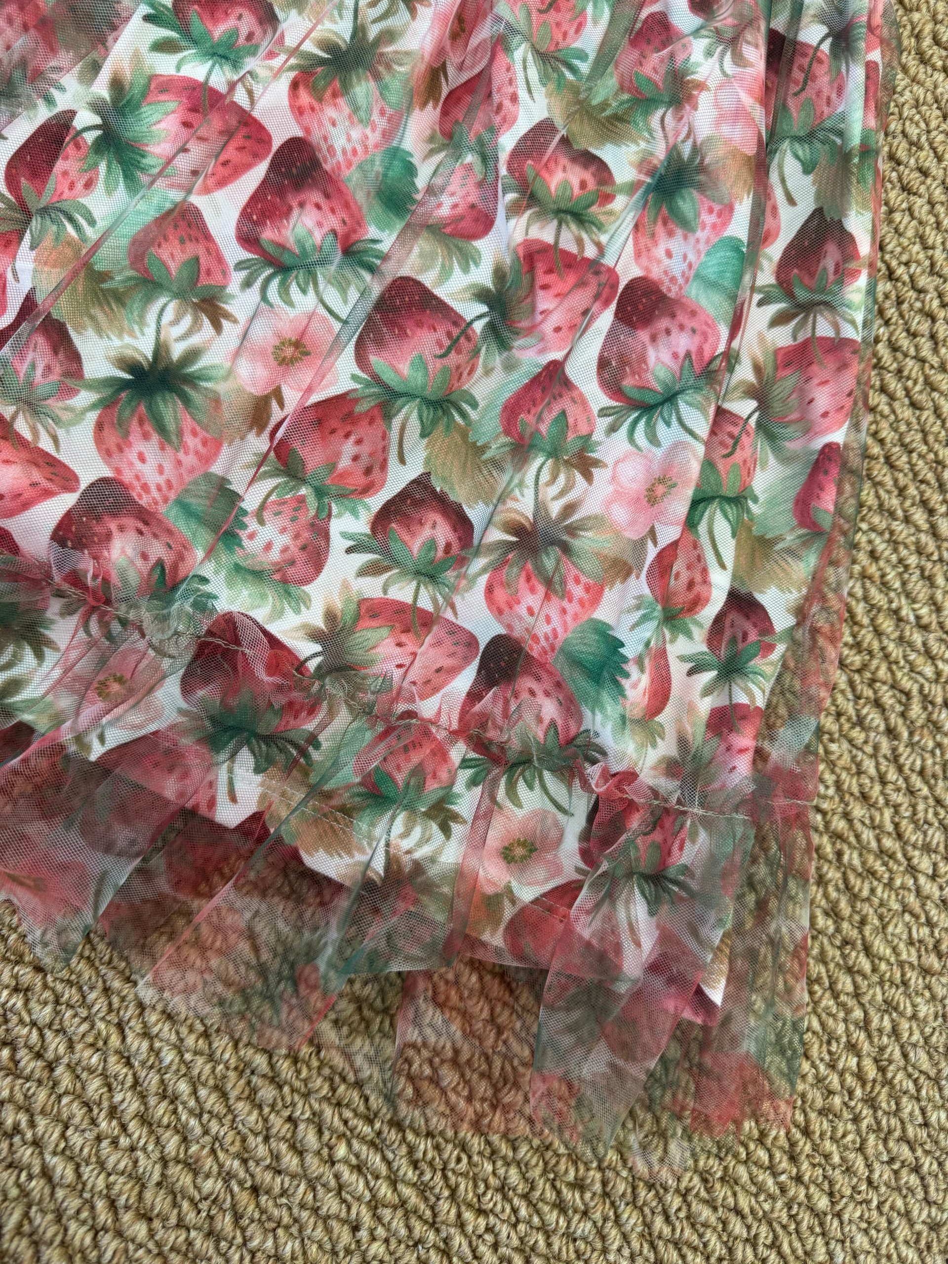 - Tessuto: leggero cotone e strati in tulle vaporoso, caratterizzato da una fantasia di fragole rosse su fondo chiaro, che dona freschezza e vivacitร .