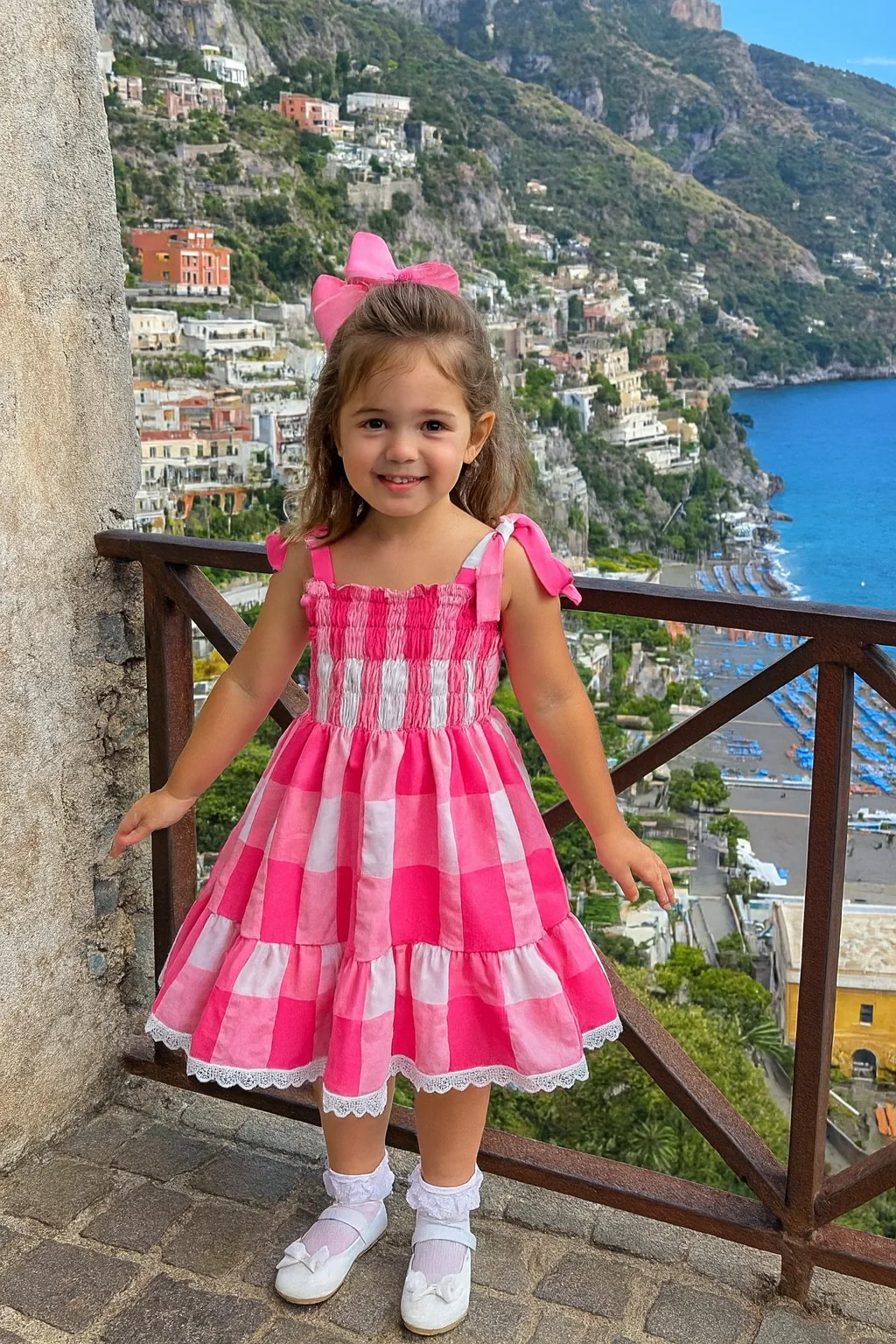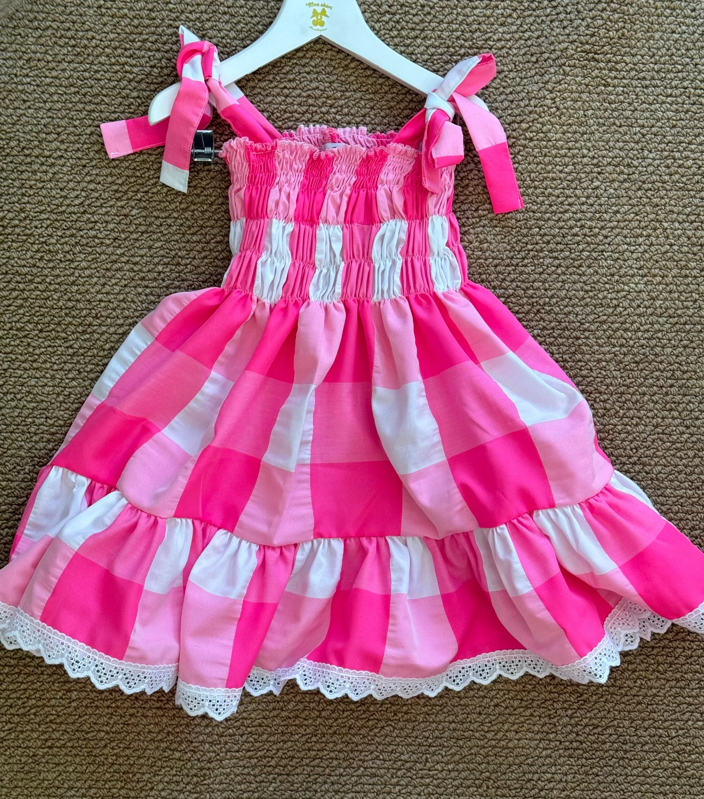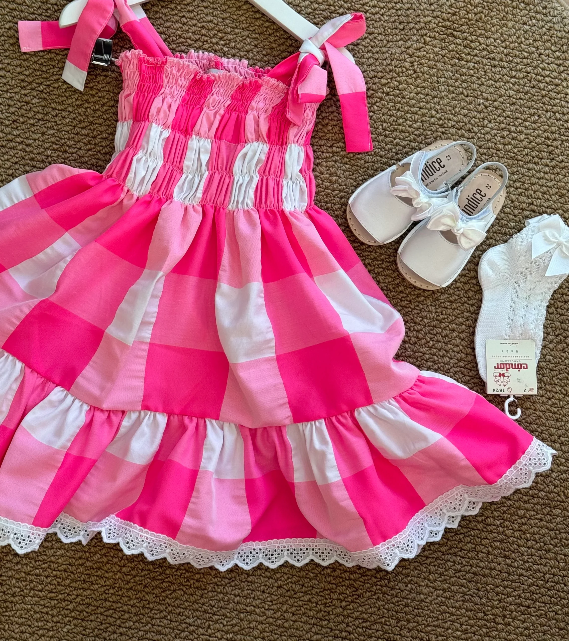 delizioso vestitino estivo per bambina, dallo stile fresco e vivace. ร realizzato in tessuto leggero 100% cotone a quadri larghi rosa acceso e bianco, con una fantasia a scacchi che dona un tocco allegro e giocoso. La parte superiore presenta una lavorazione arricciata (smock) che aderisce dolcemente al busto, con spalline a fiocco regolabili che […]