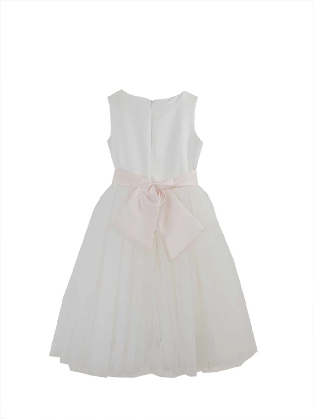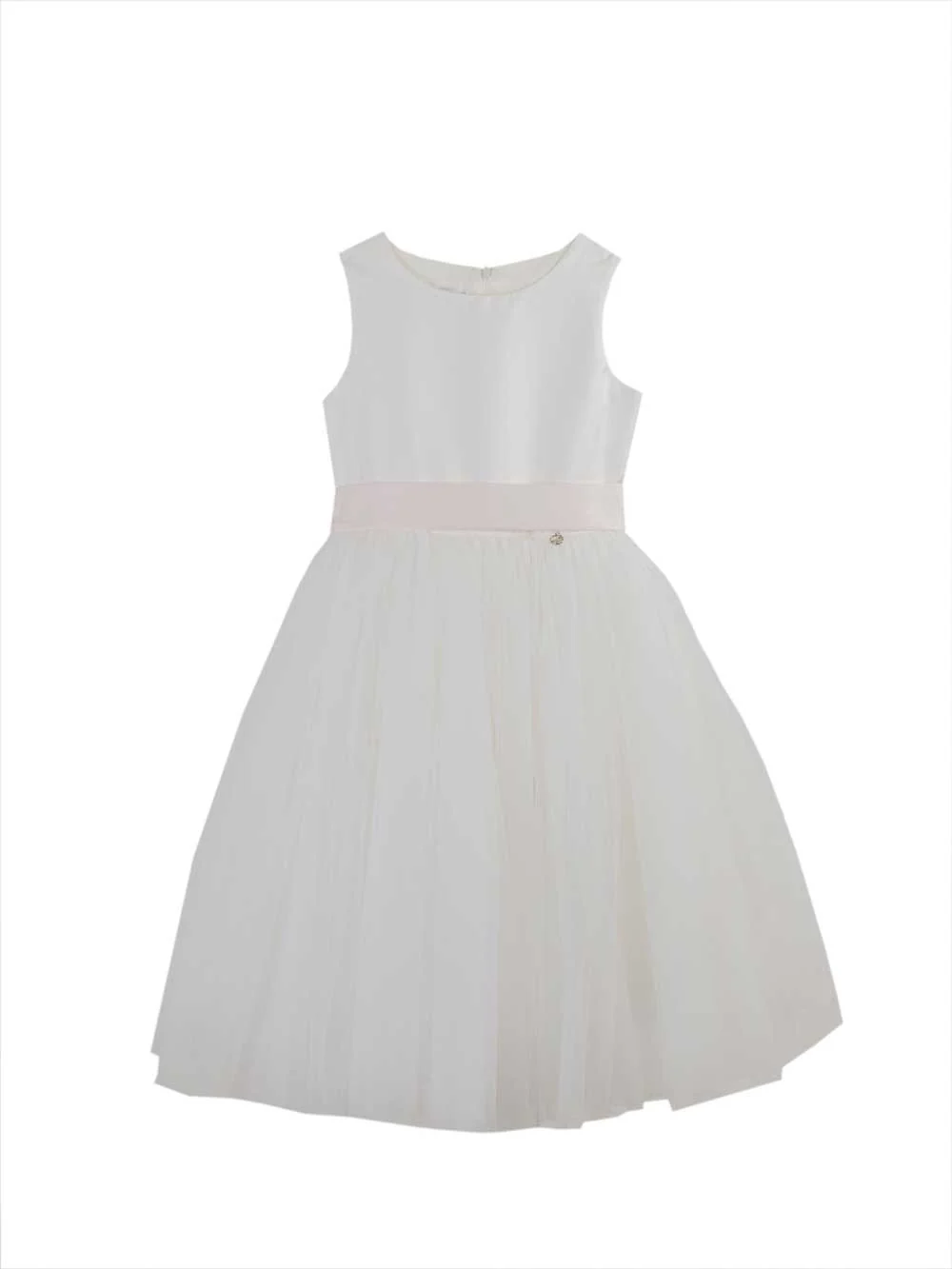 Abito elegante da bambina adatto per vestire una damigella, corpetto in raso a tinta unita, sottogonna in tulle per donare ampiezza, chiusura posteriore con cerniera invisibile, cintura in contrasto di colore.