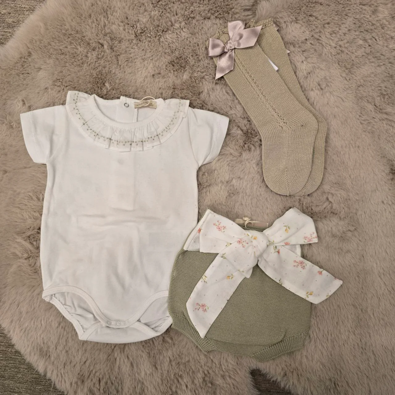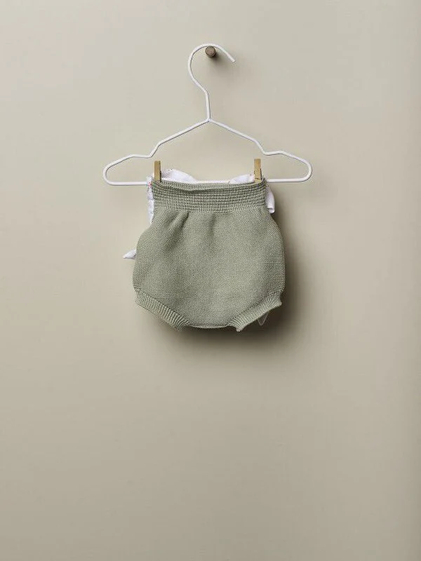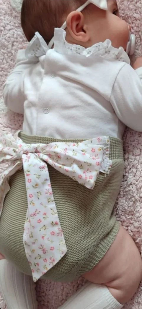 Body + shorts con dettagli a maglia fine in morbido cotone verde, ideale per neonati , fino a 24 mesi. Il pantaloncino ha un grazioso nastro sul retro in cotone biologico leggero con una delicata stampa a fiori rosa e verdi su uno sfondo bianco latte. La morbida fascia elastica consente il massimo comfort. Il body riprende sul colletto il colore verde salvia dei pantalonci