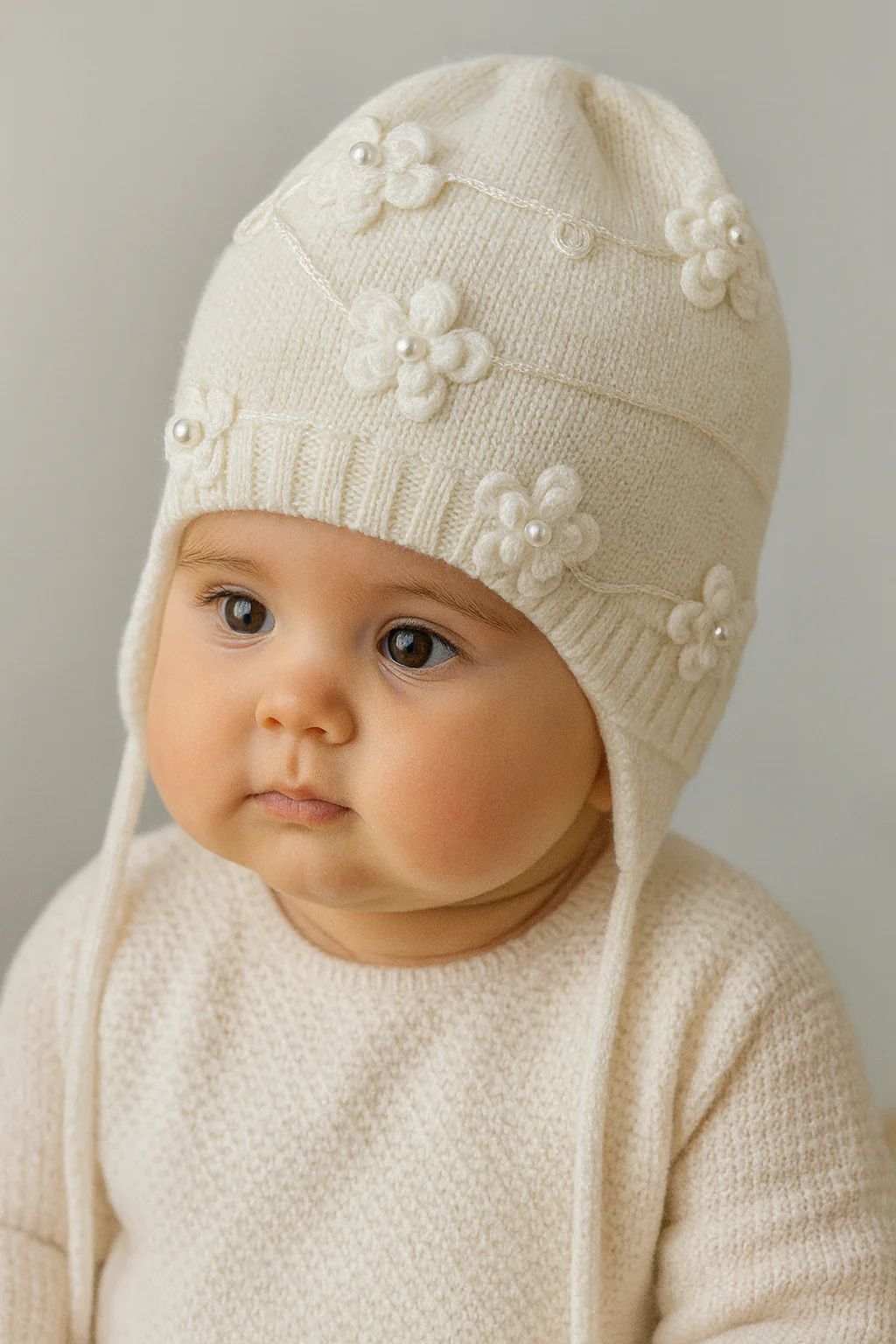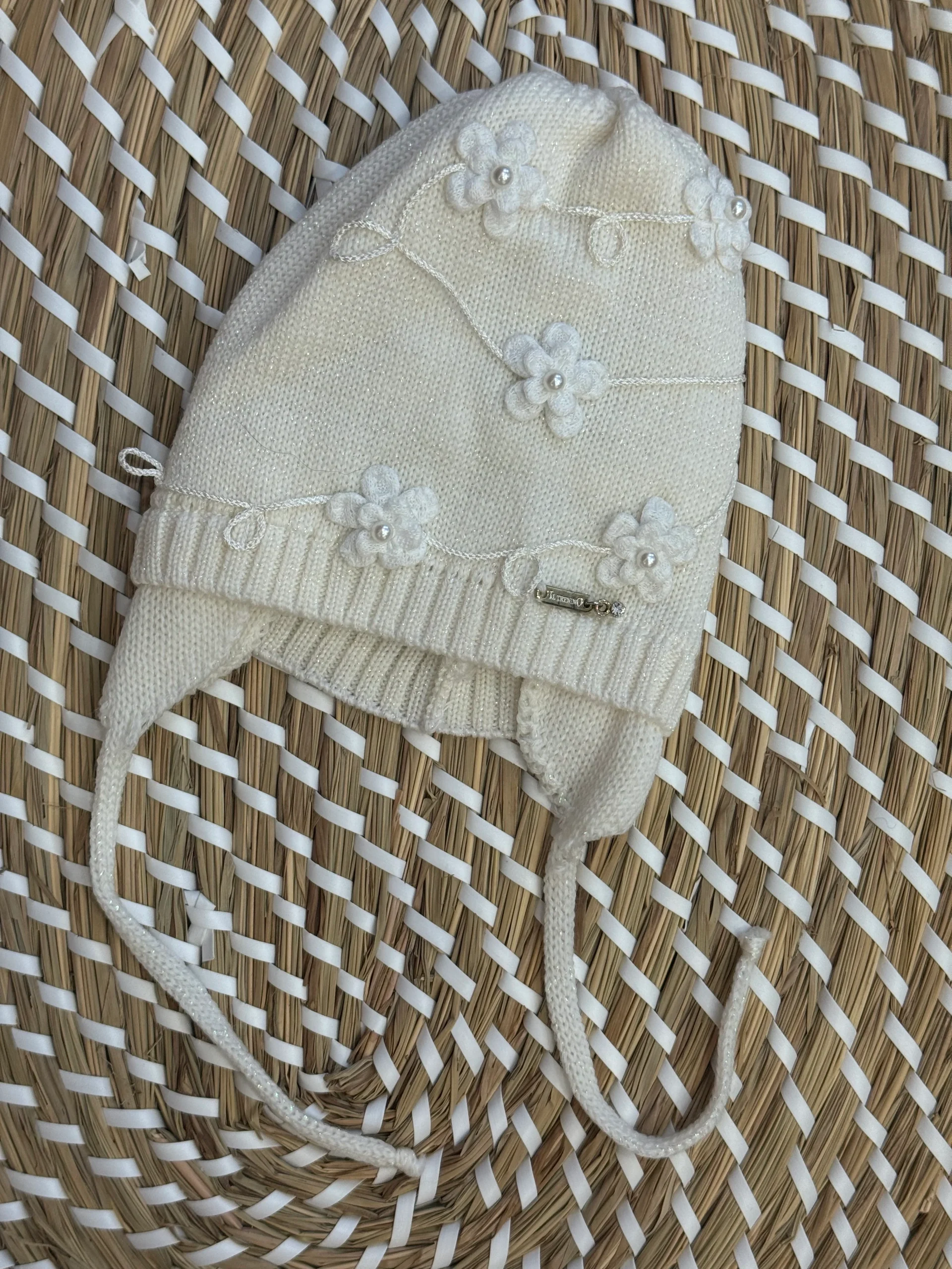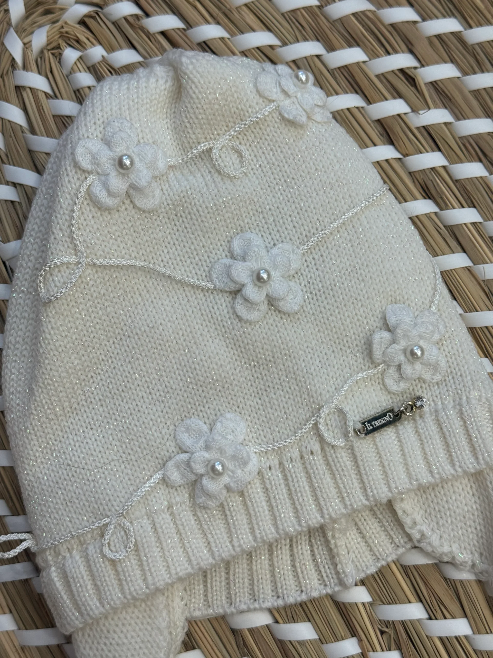 Cappello in lana con paraorecchie e laccetto. particolare il suo ricamo in 3D con fiori tono su tono e la trama leggermente glitterata. 226006/lana/n – 226006/lana/callot