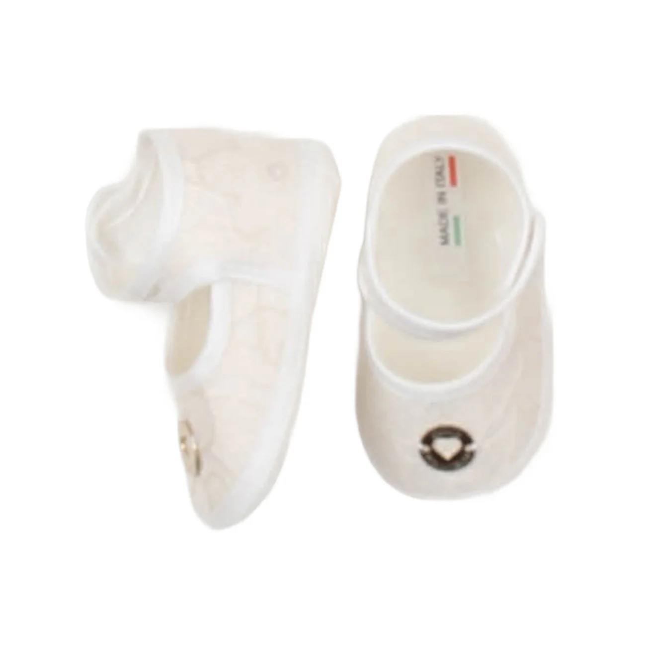 Scarpine Panna per Neonata Realizzate in Italia con maestria artigianale Tessuto in poliestere 100% di qualità superiore Design elegante e raffinato, ideale per occasioni speciali Chiusura a velcro per un indosso pratico e sicuro Perfette per cerimonie e momenti importanti