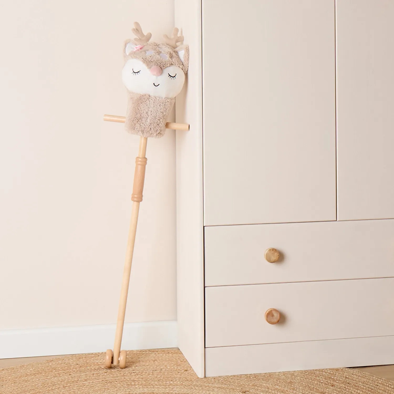 La struttura solida e le comode maniglie laterali garantiscono una presa sicura, mentre le ruote lisce non lasciano segni sul pavimento e scorrono facilmente su superfici lisce. Il bastone può essere diviso in due parti per una conservazione e un trasporto più comodi. Il cerbiatto Ella sarà un fedele compagno di avventure, sia per una tranquilla passeggiata nel bosco delle fiabe che per una corsa sfrenata piena di risate!