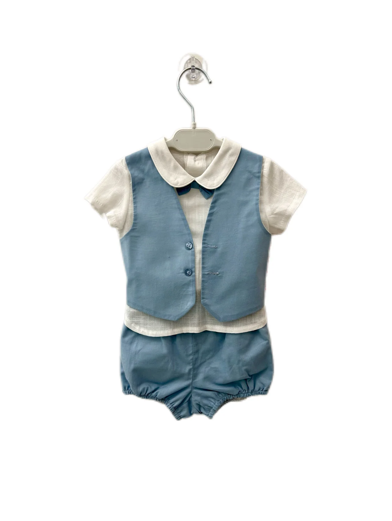Elegante completo bimbo 2 pezzi composto da una camicia con papillon coordinato e un raffinato gilet. Un look perfetto per cerimonie e occasioni speciali.