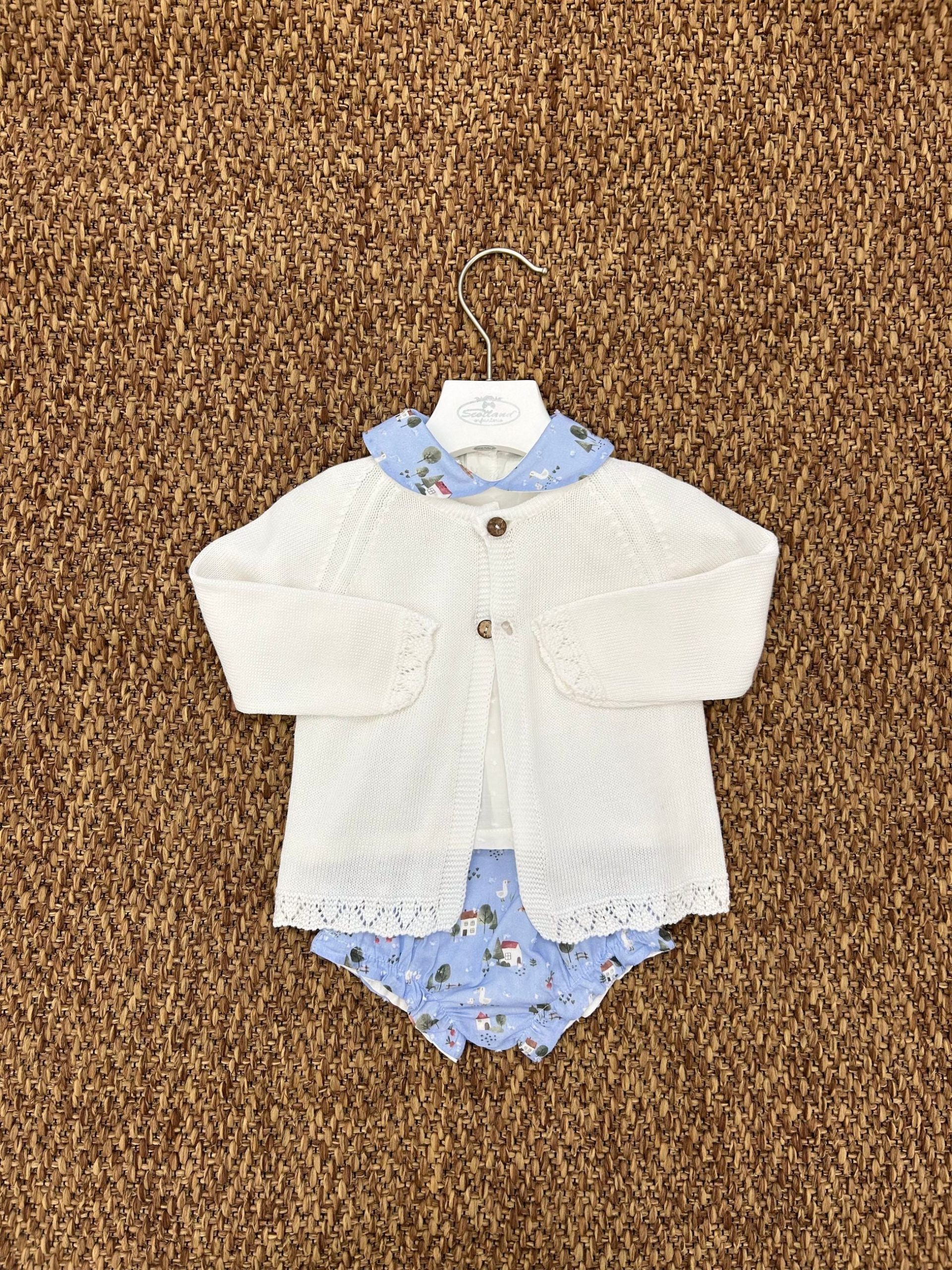 Delizioso completino per bambino composto da 3 pezzi, ideale per donare un tocco di dolcezza e raffinatezza al look della piccola. Realizzato con tessuti morbidi e traspiranti, assicura comfort e libertà di movimento.