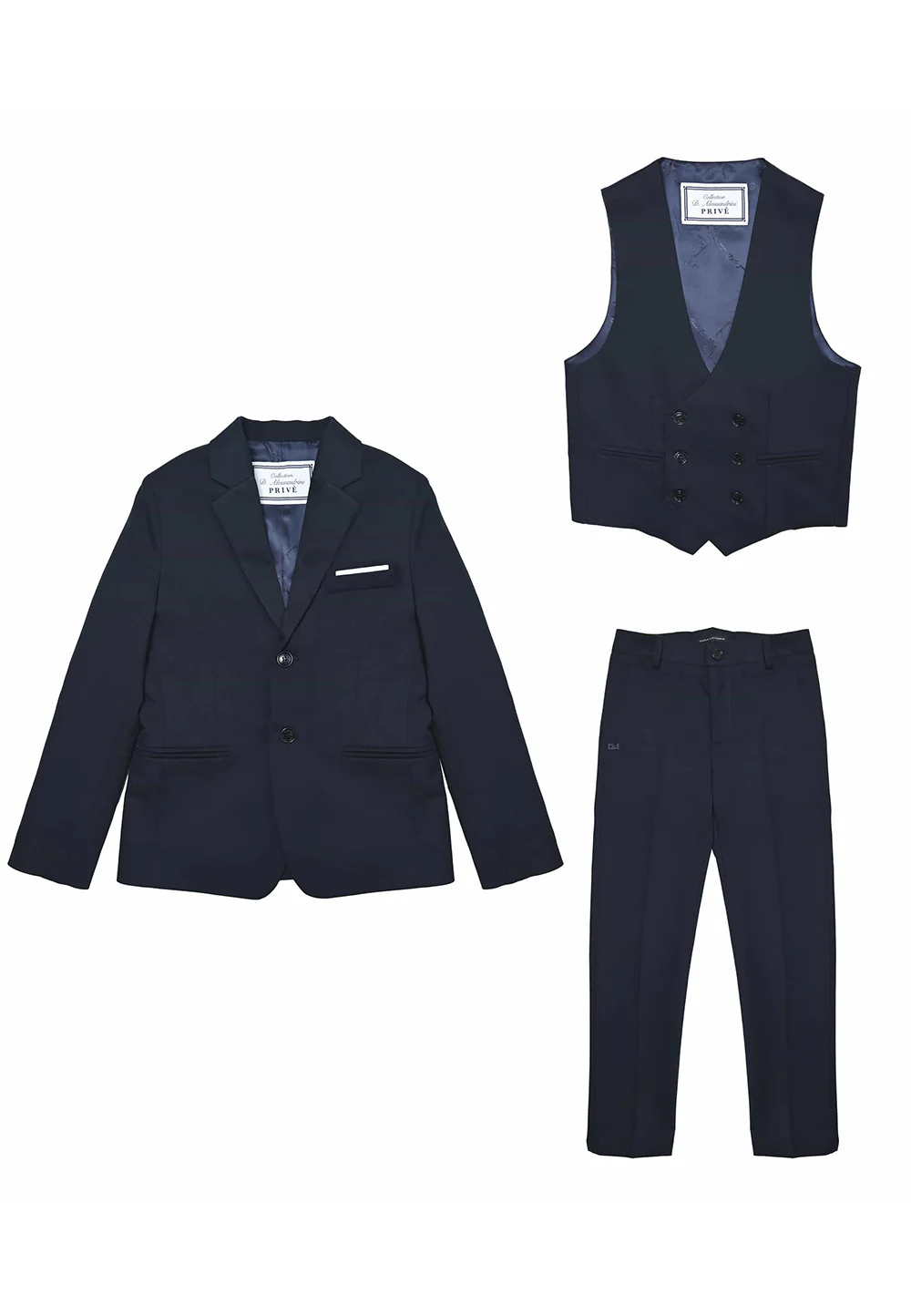 Scopri il fascino del completo elegante firmato DANIELE ALESSANDRINI, ideale per rendere unico ogni momento speciale del tuo bambino. Perfetto per cerimonie come la prima comunione o come outfit da paggetto, il completo comprende pantaloni slim fit, gilet doppio petto e una giacca elegante con due bottoni, tutti realizzati con cura per garantire comfort e stile ineguagliabili.