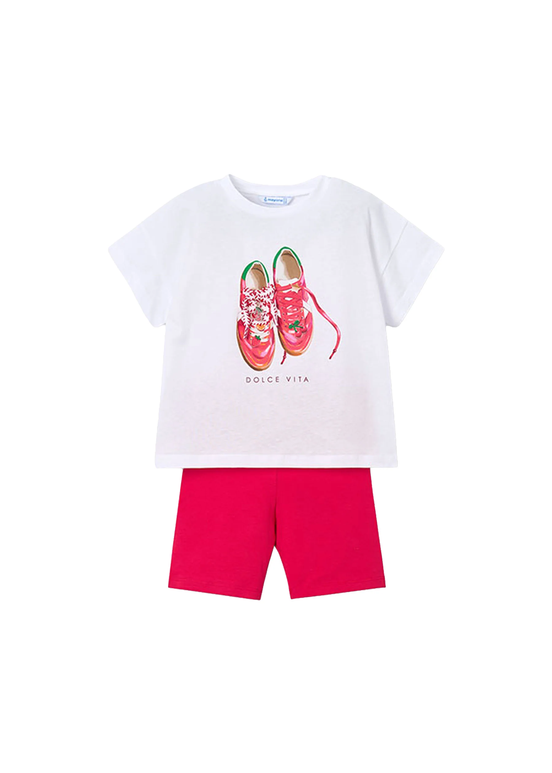 Realizzato con cura nei minimi dettagli, il nostro completo MAYORAL è composto da una vivace t-shirt con stampa scarpe e una ciclista tinta unita. Tutto è realizzato in 100% cotone, che garantisce comfort e traspirabilità anche nelle giornate più calde, e l’imbottitura in cotone aggiunge un tocco di morbidezza. La vestibilità slim fit assicura una linea elegante senza sacrificare l’agio.