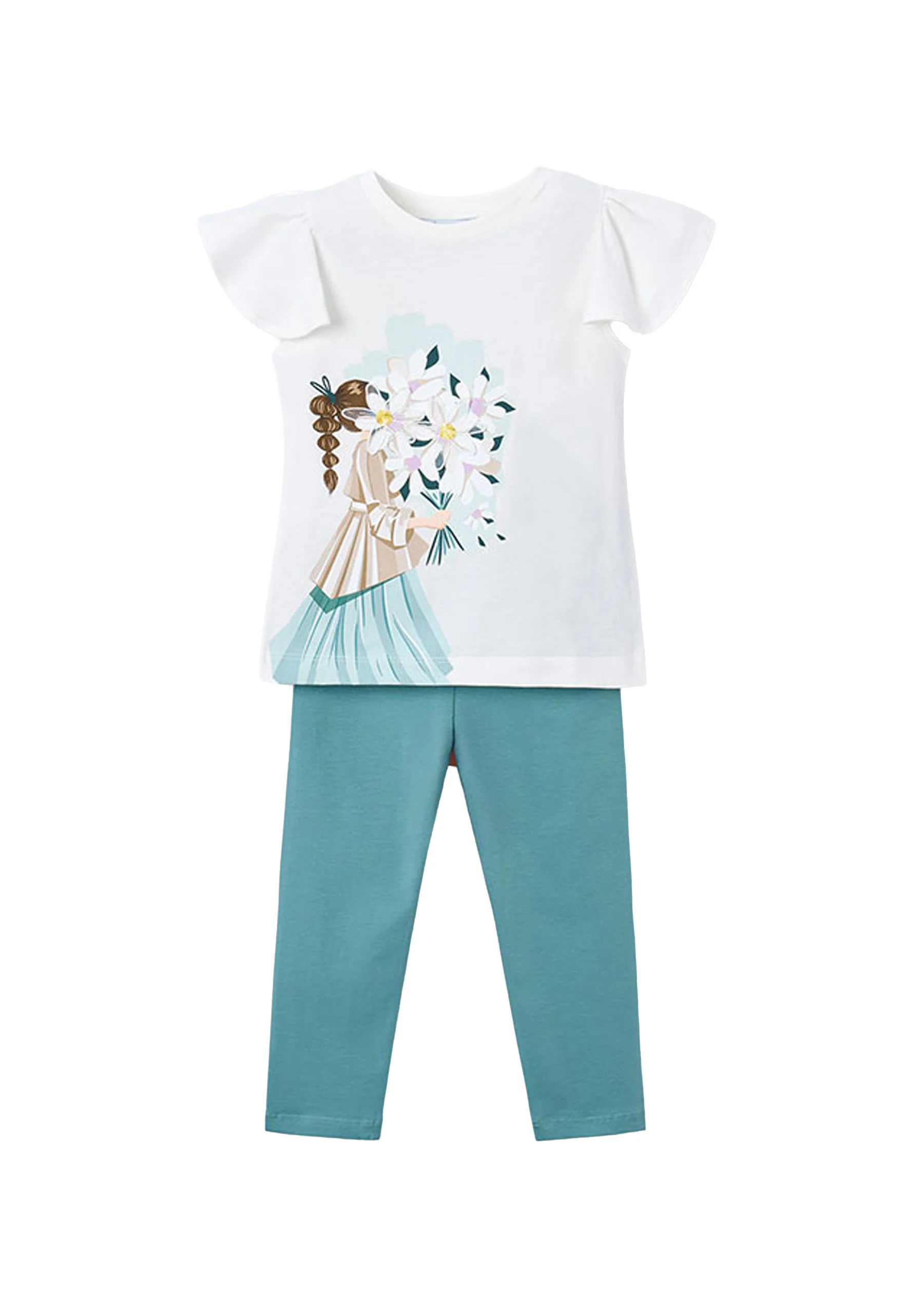 Realizzato con una cura speciale per i materiali, questo completo è composto da una t-shirt 100% cotone con manica corta e girocollo. La grafica, raffigurante una ragazza con fiori, è vivace e piacevolmente femminile. In abbinamento, troverai leggings tinta unita, per un look casual ma ricercato. La vestibilità slim fit garantisce il massimo comfort senza rinunciare allo stile.