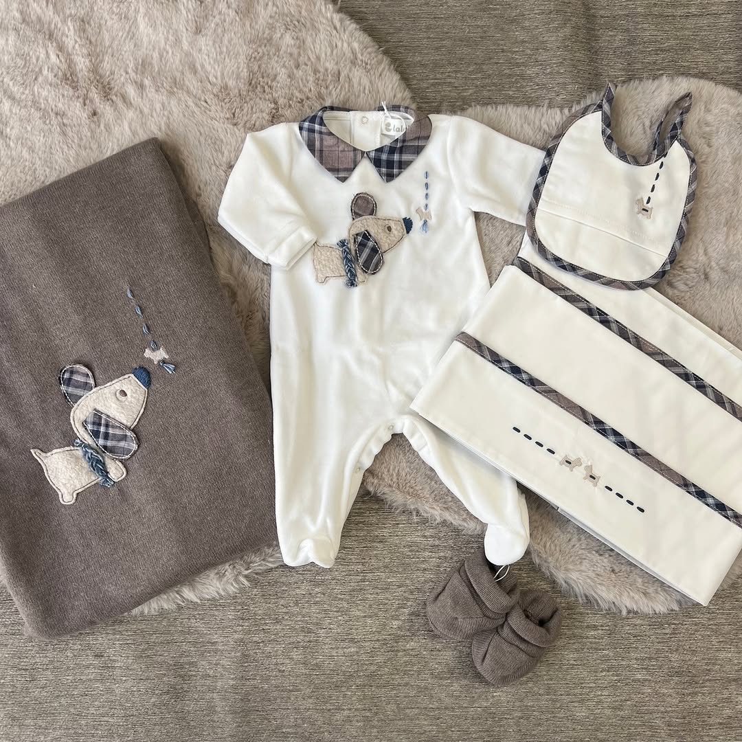 Dai il benvenuto al tuo piccolo con il nostro morbido e caldo corredino Lalalù ciniglia a costine! Design azzurro con orso polare e stelle per rendere il tuo bebè ancora più coccolato. Ideale per i giorni invernali, garantendo comfort e stile al tuo bimbo.