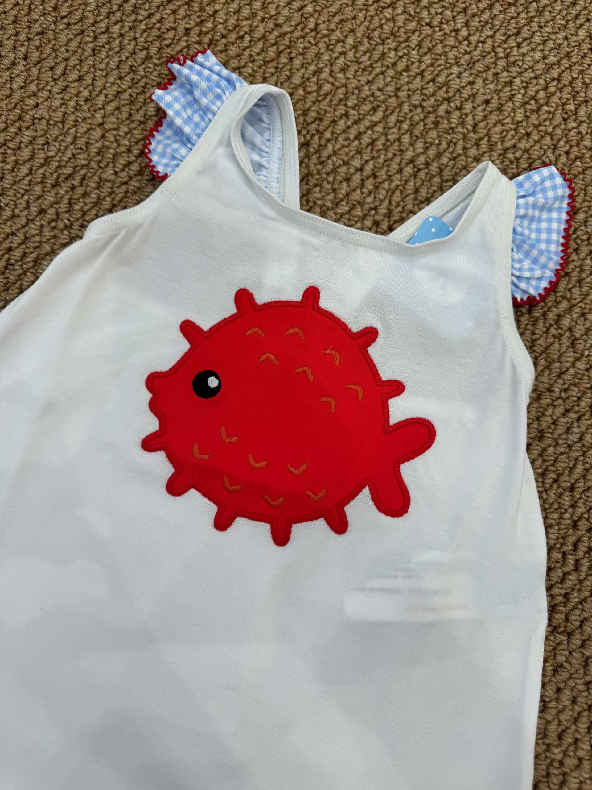 Il copricostume ad abitino in cotone con bretelle e personaggio pesce palla.