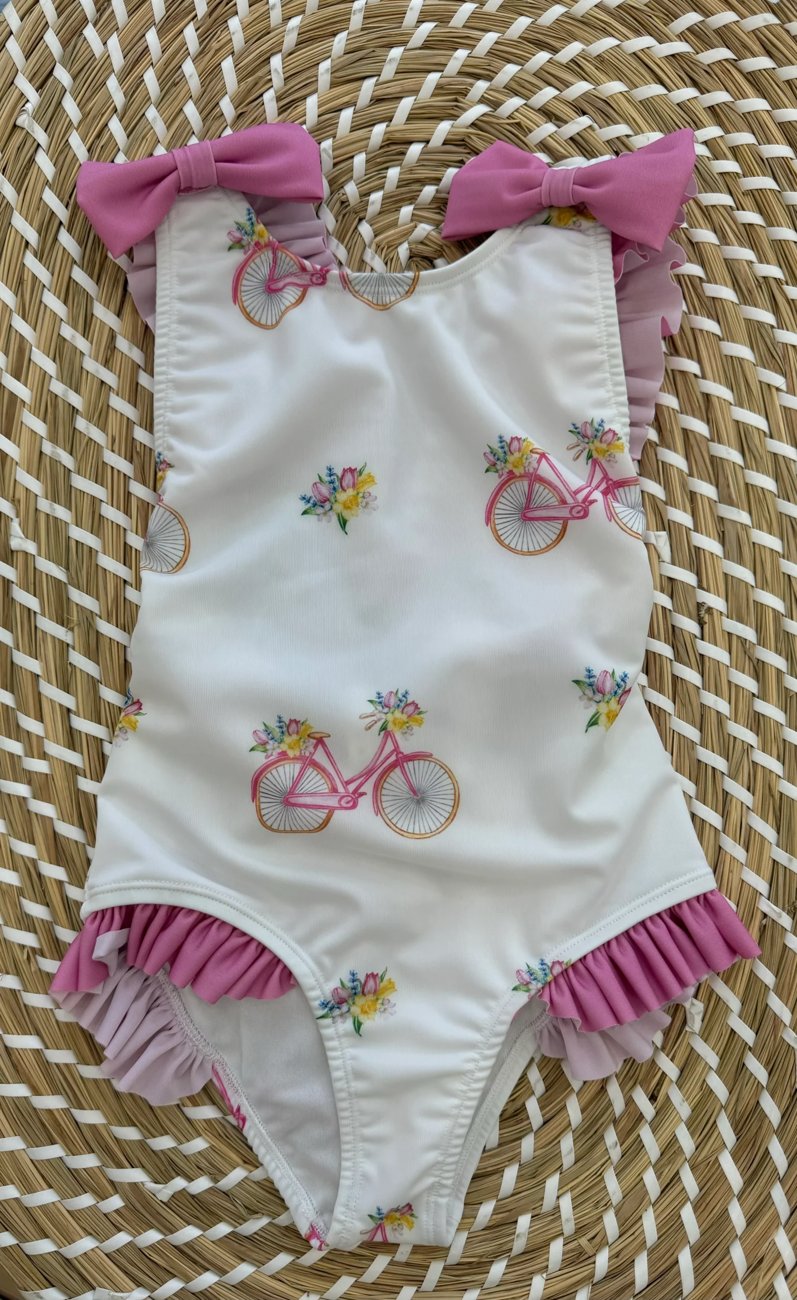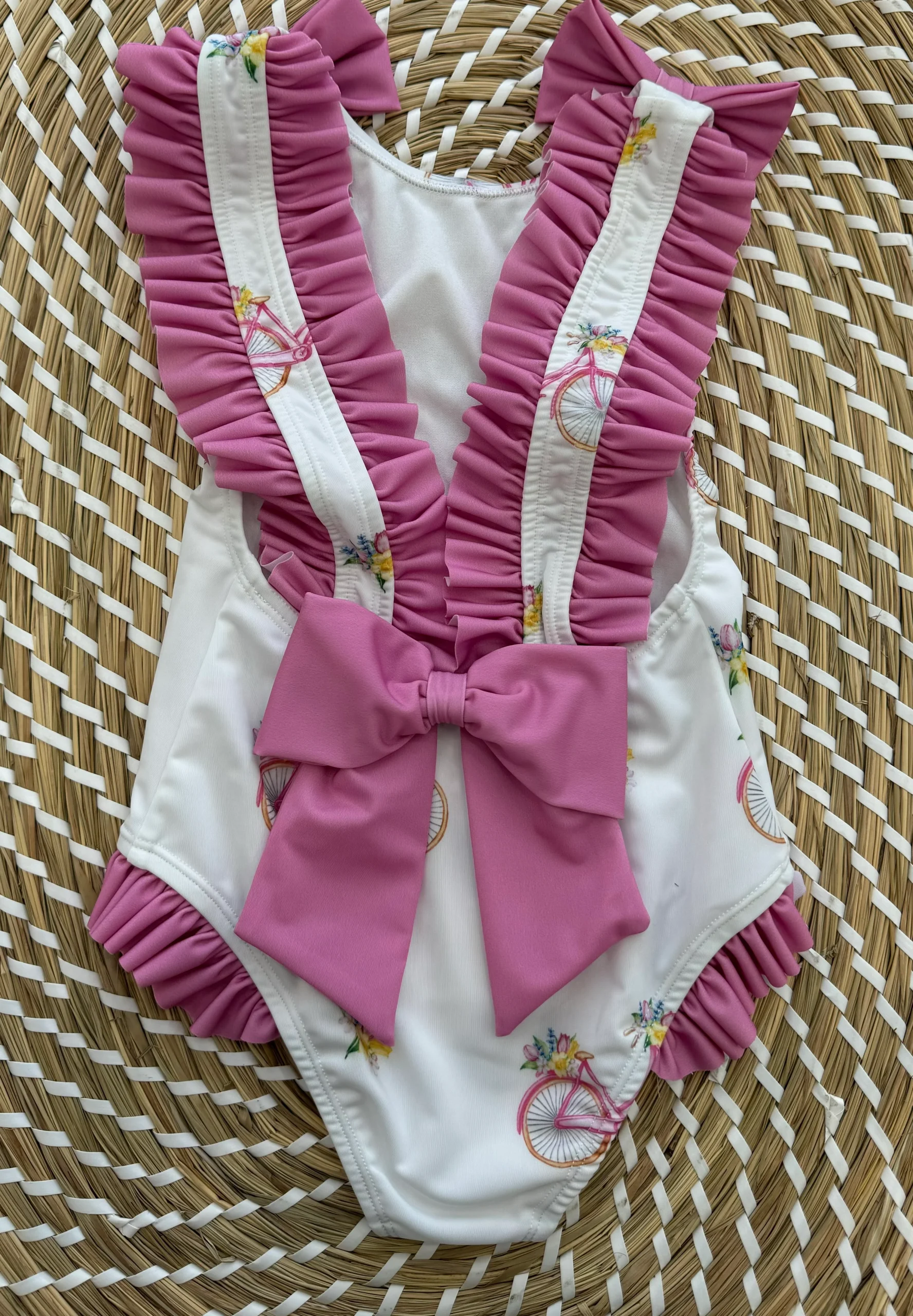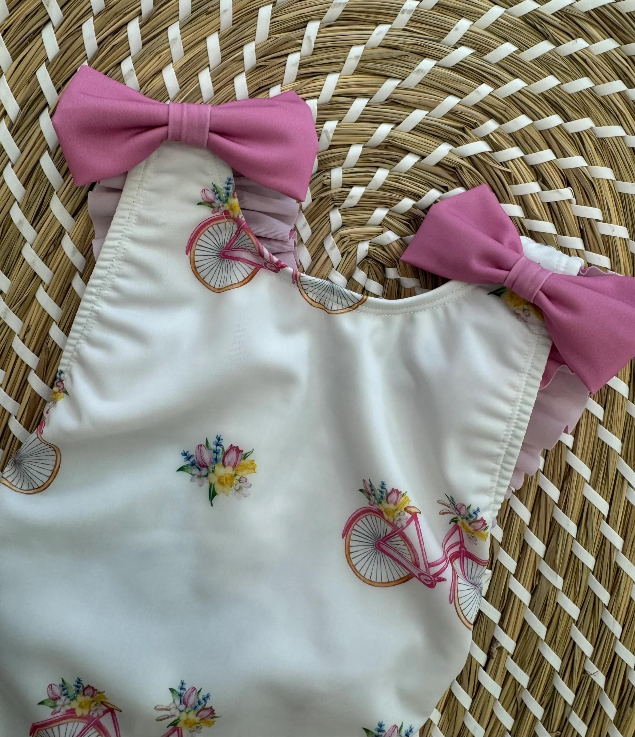 Costume intero fantasia bicicletta. bretelle con piccole balze. piccoli fiocchetti sulle spalle e sul retro gran fiocco.