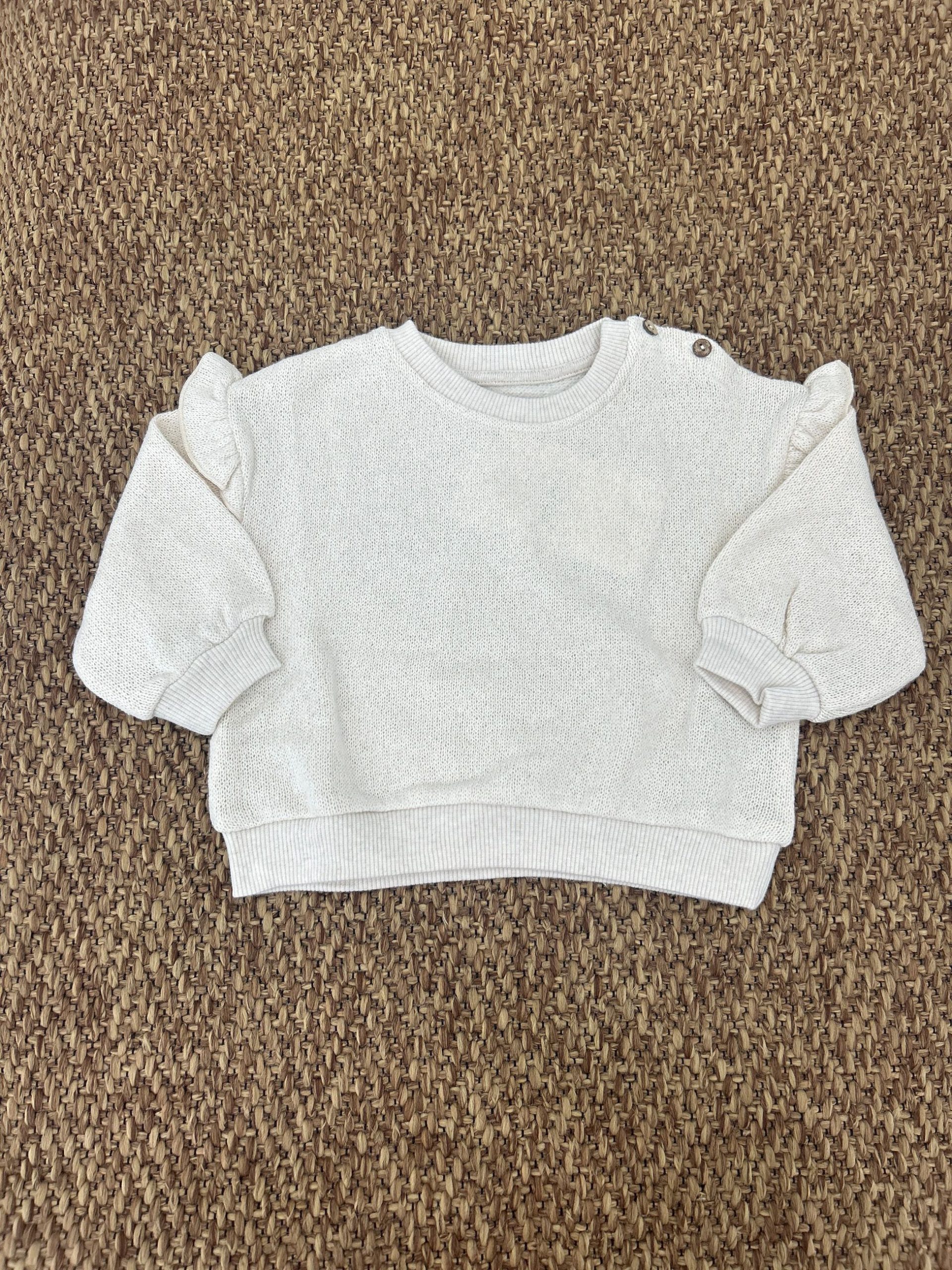 Questa felpa è realizzata in maglia con una miscela di cotone rigenerativo e cotone riciclato. Presenta scollo rotondo, polsini e cintura elasticizzati, dettaglio con volant sulle maniche e apertura sulla spalla con bottoni in cocco.