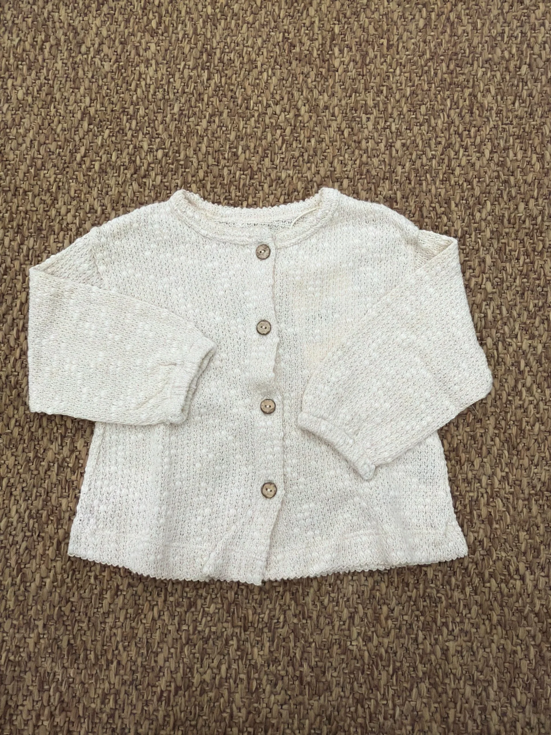 Questa giacca è realizzata in maglia con una miscela di cotone e cotone riciclato, nel colore Naturale. Presenta maniche lunghe, scollo rotondo, elastico sui polsini e apertura frontale con bottoni in cocco.