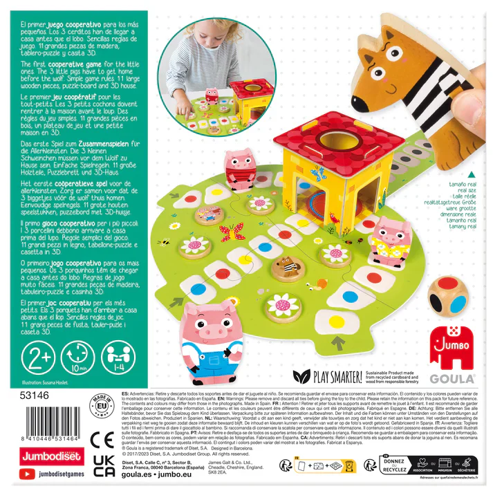 Gioco prescolare con due modalità di gioco: cooperativa e competitiva. Da 1 a 4 giocatori. Il gioco cooperativo promuove valori diversi per i bambini e insegna loro a rispettare le regole del gioco. Tutti i giocatori collaborano per portare in salvo i tre porcellini prima dell’arrivo del lupo. Ognuno può muovere tutti i personaggi; a turno, tirano il dado e muovono il maialino che si trova davanti al colore indicato dal dado (blu / giallo / rosso). Se il dado si ferma sul nero, il lupo avanza di una casella. Se il dado si ferma sul bianco, il giocatore può scegliere un personaggio e avanzare di una casella. Se il dado si ferma sul fiore, il giocatore può ruotare una pedina rotonda sul tabellone di gioco: se trova un maialino, tutti i porcellini avanzeranno di una casella, ma se trova il lupo, il lupo avanzerà di una casella. Gioco competitivo per tre giocatori. Ogni giocatore sceglie un maialino, spostandolo nella casella più vicina al colore indicato dal dado. Nessuno gioca con il lupo, sebbene la sua funzione sia la stessa della versione cooperativa. Il primo giocatore che raggiunge la casa vince.