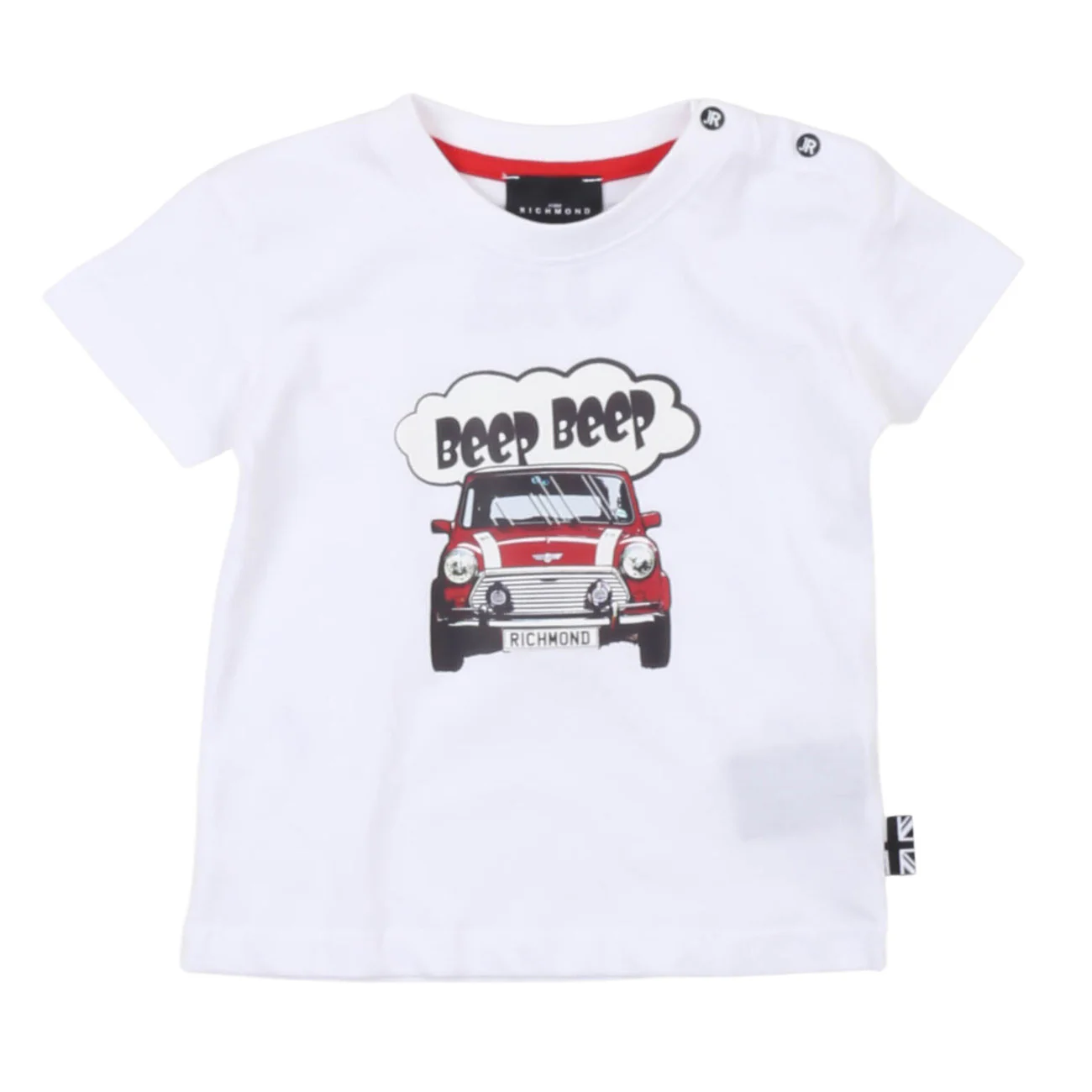 Maglietta bianca a maniche corte per neonati con stampa audace con macchina “beep beep” che cattura lo spirito giocoso dei piccoli esploratori. Realizzata con materiali morbidi e confortevoli, questa t-shirt John Richmond è perfetta per le giornate estive o per creare look casual e dinamici. Un capo essenziale che unisce stile contemporaneo e praticità, ideale per chi vuole vestire il proprio bambino con personalità e carattere.
