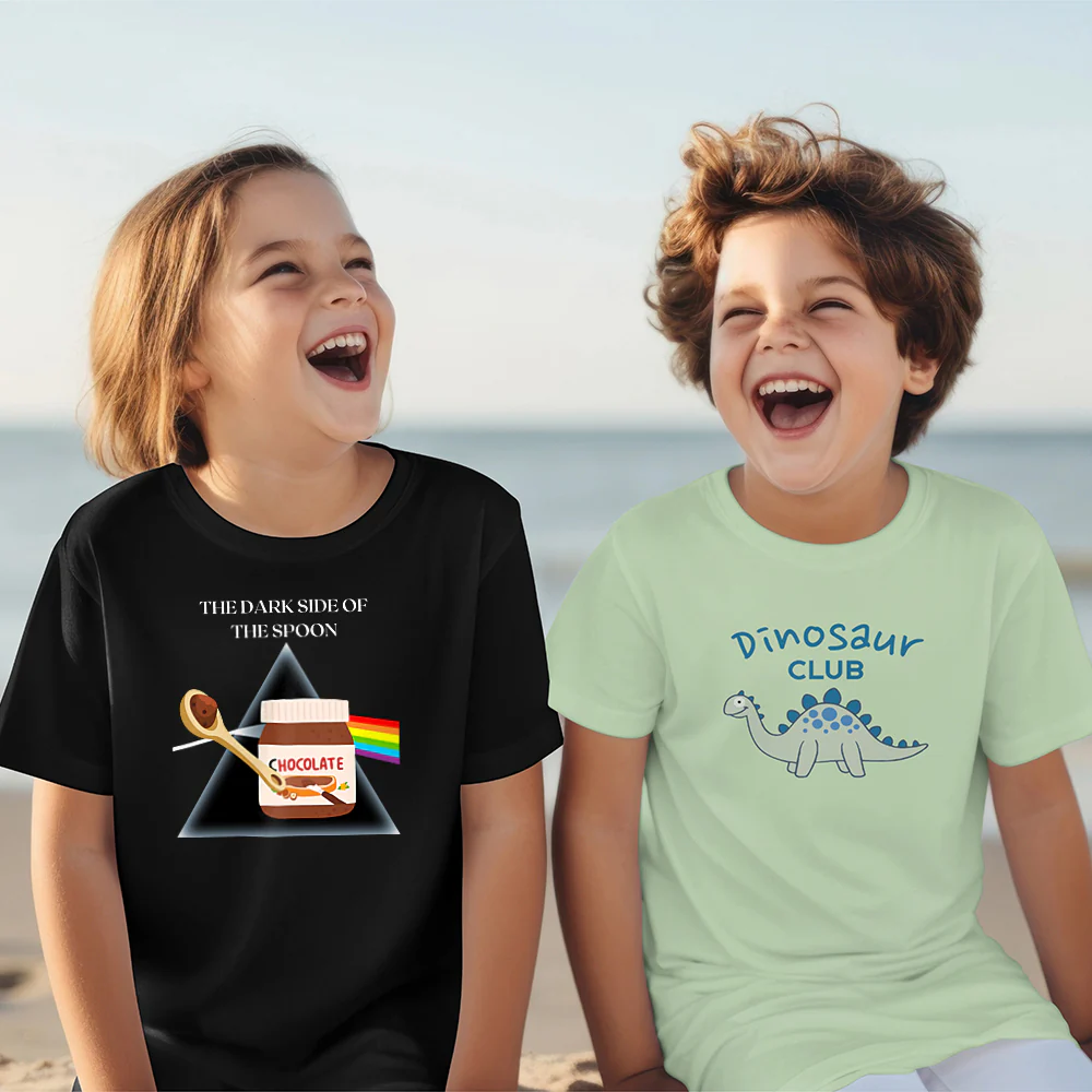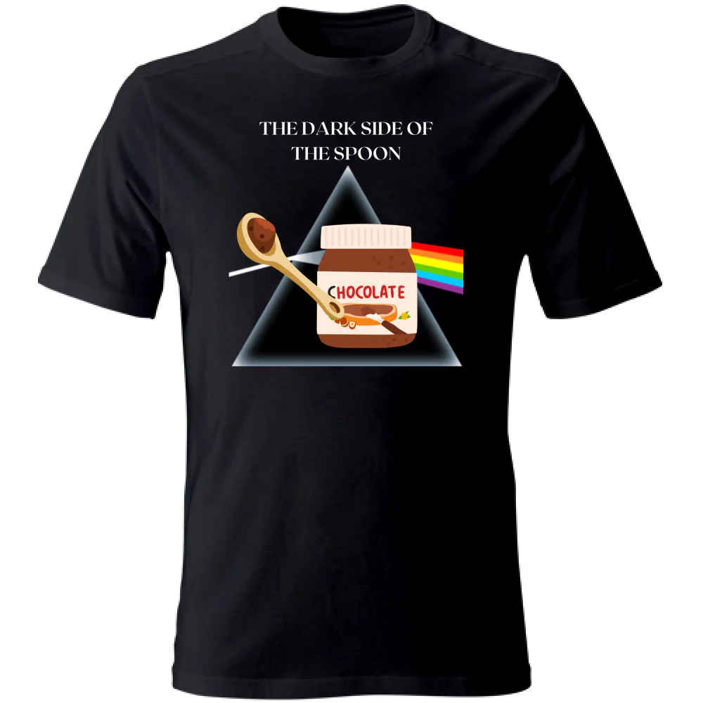 Scopri la nostra esclusiva T-shirt nera a manica corta per bambina e bambino, perfetta per i piccoli fan della musica e del cioccolato. Realizzata in morbido cotone di alta qualità, questa maglietta unisce comfort e stile con un design unico. Sul davanti, un divertente disegno che rappresenta il lato scuro del cucchiaio e un arcobaleno, accompagnato dalla frase “The Dark Size of the Spoon”, una parodia originale della famosa canzone dei Pink Floyd.