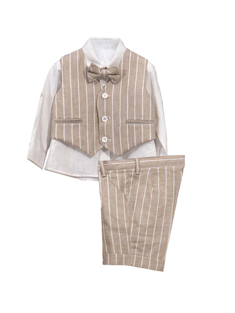 Completo da bambino adatto a battesimo o paggetto composto da 5 pezzi, camicia manica lunga con bottone e fibbia per accorciare le maniche, bermuda con lunghezza sotto al ginocchio, panciotto con chiusura a 3 bottoni, papillon.